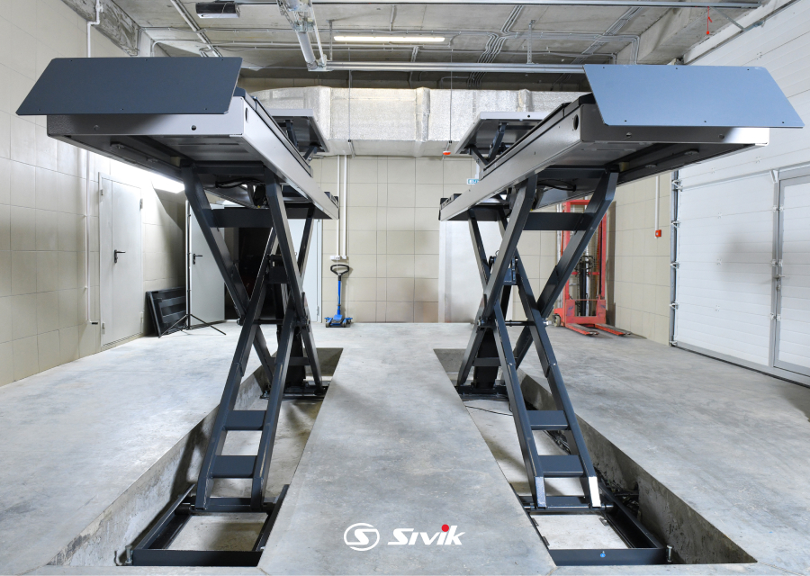 • Электрогидравлический ножничный подъемник для сход-развала с подъемником второго уровня